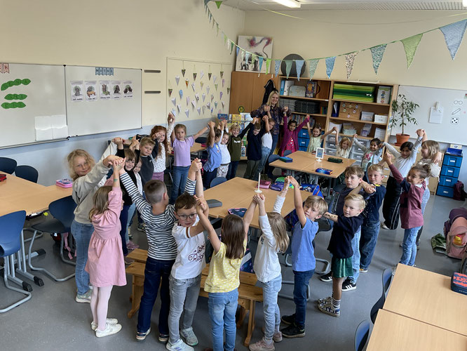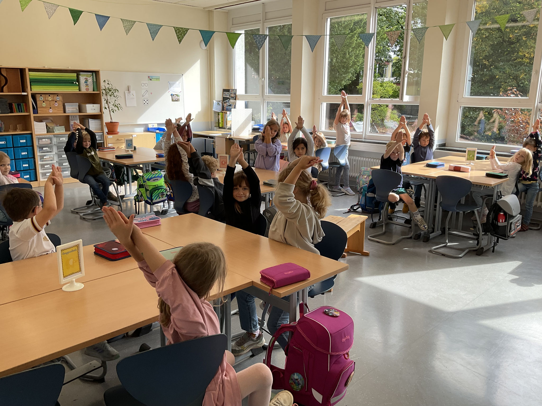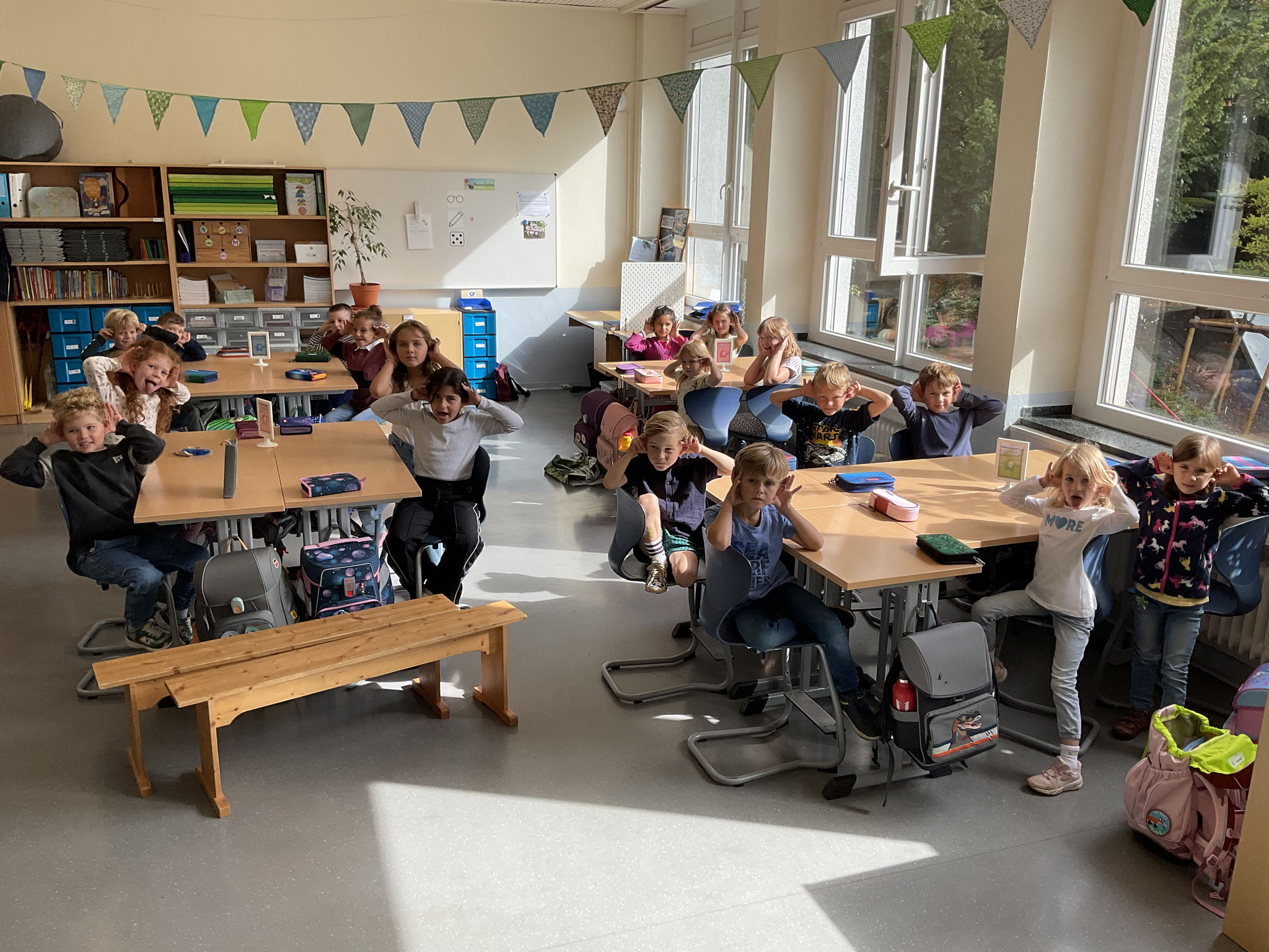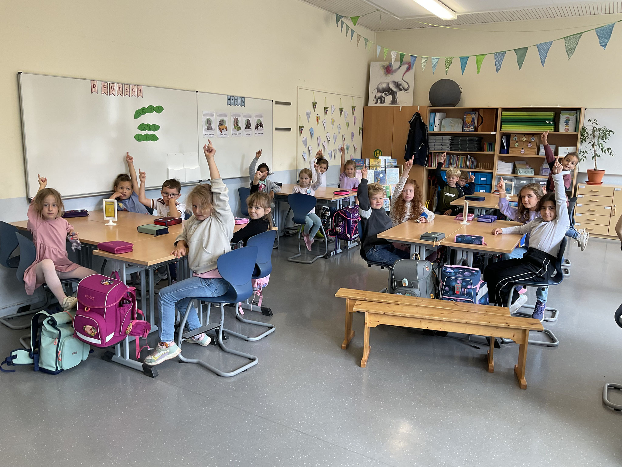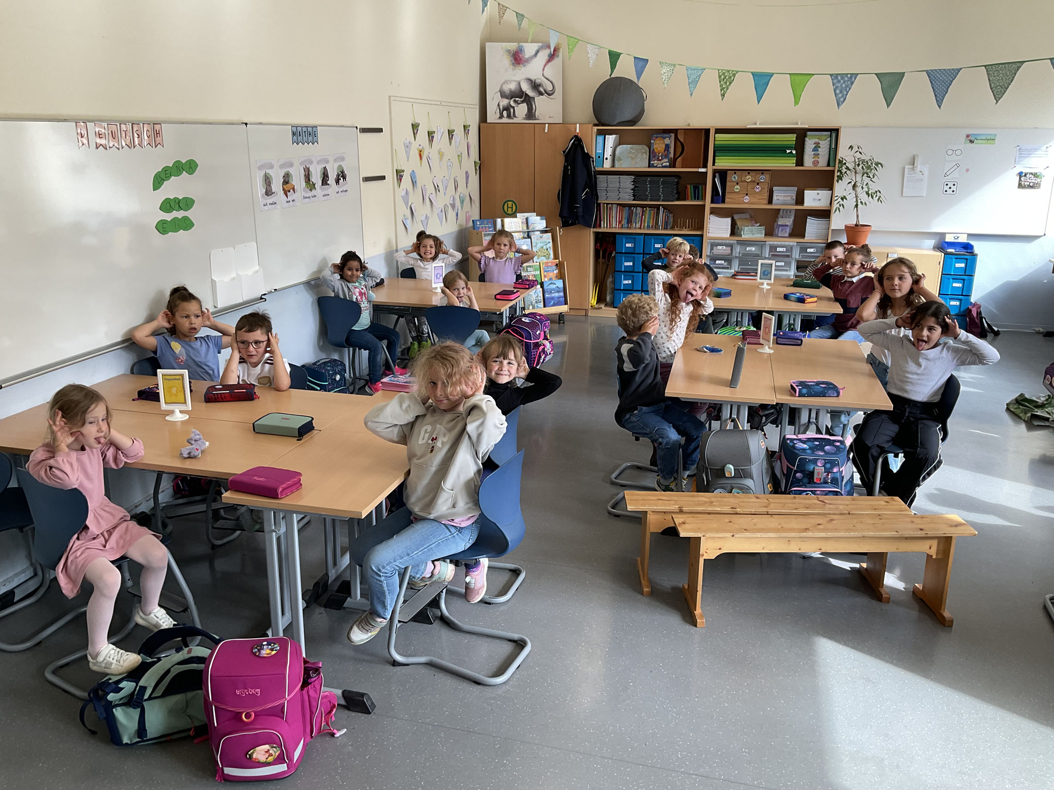 Wir sind die Kinder der Elefantenklasse (1b). Seit dem Sommer 2024 lernen wir hier nun das Lesen, Schreiben, Rechnen und noch vieles mehr. Wir sind 28 Kinder und unsere Klassenlehrerin ist Frau Mutzberg. Unser Klassentier Elmo ist ebenfalls immer dabei. Er ist natürlich ein Elefant. Nun ein paar Einblicke in unseren Alltag. In der ersten Schulwoche haben wir gemeinsam Regeln aufgestellt, damit sich alle wohl fühlen. Die haben wir dargestellt und fotografiert, damit wir sie nicht vergessen.