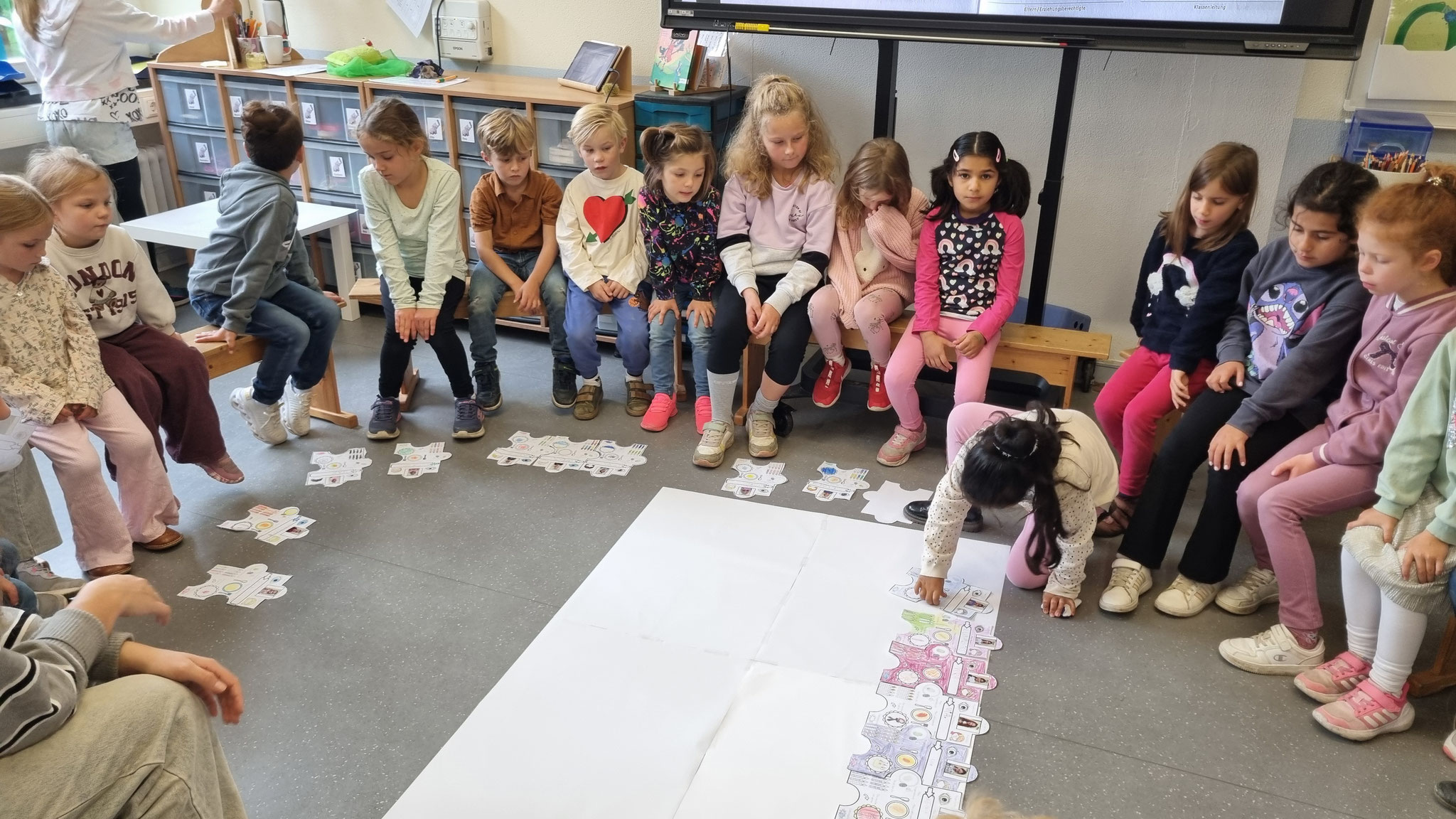 Wir haben ein Gemeinschaftspuzzle erstellt und wachsen jeden Tag ein bisschen mehr als Team zusammen. In der Schule haben wir viel Spaß und Elmo ist immer dabei.